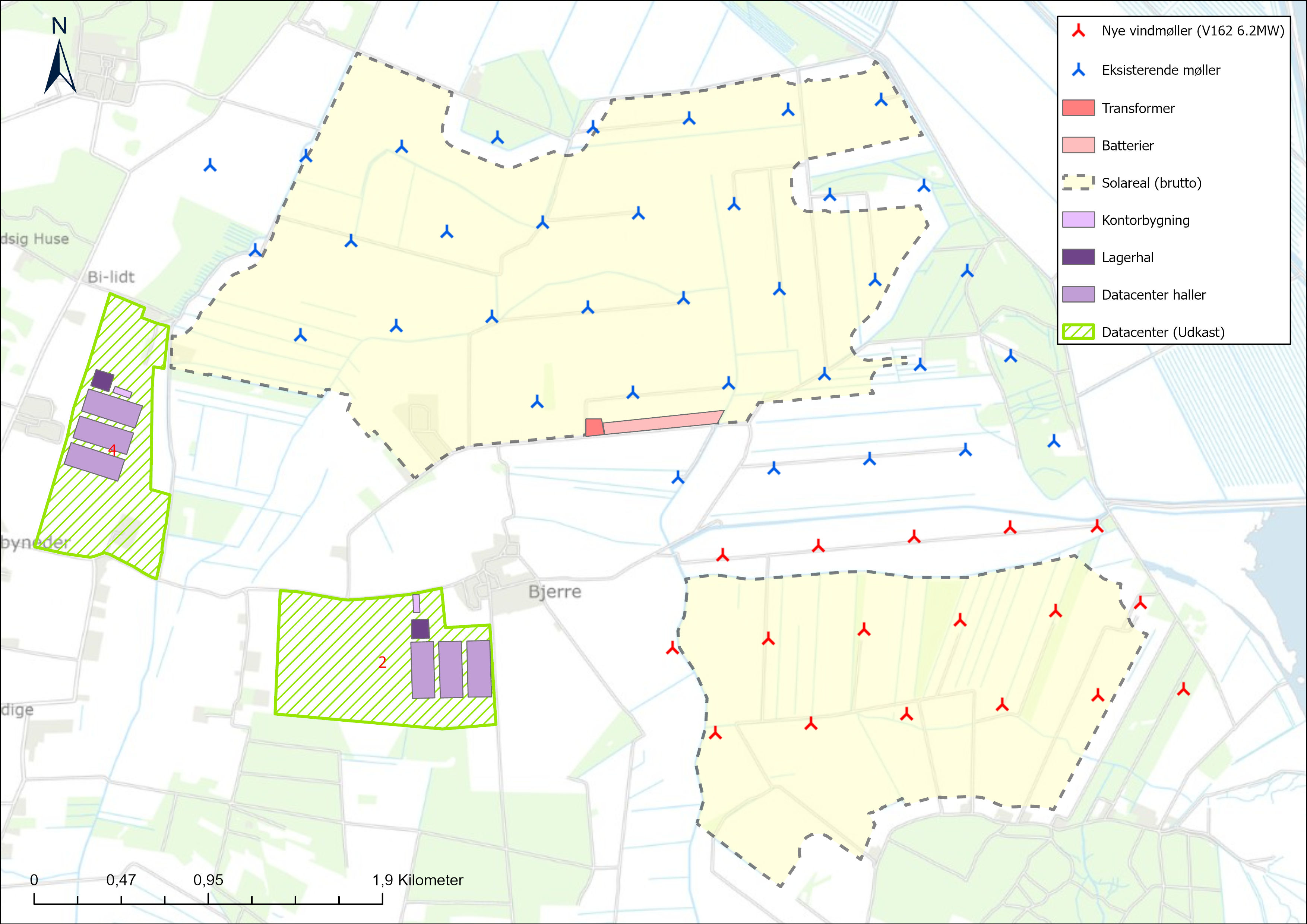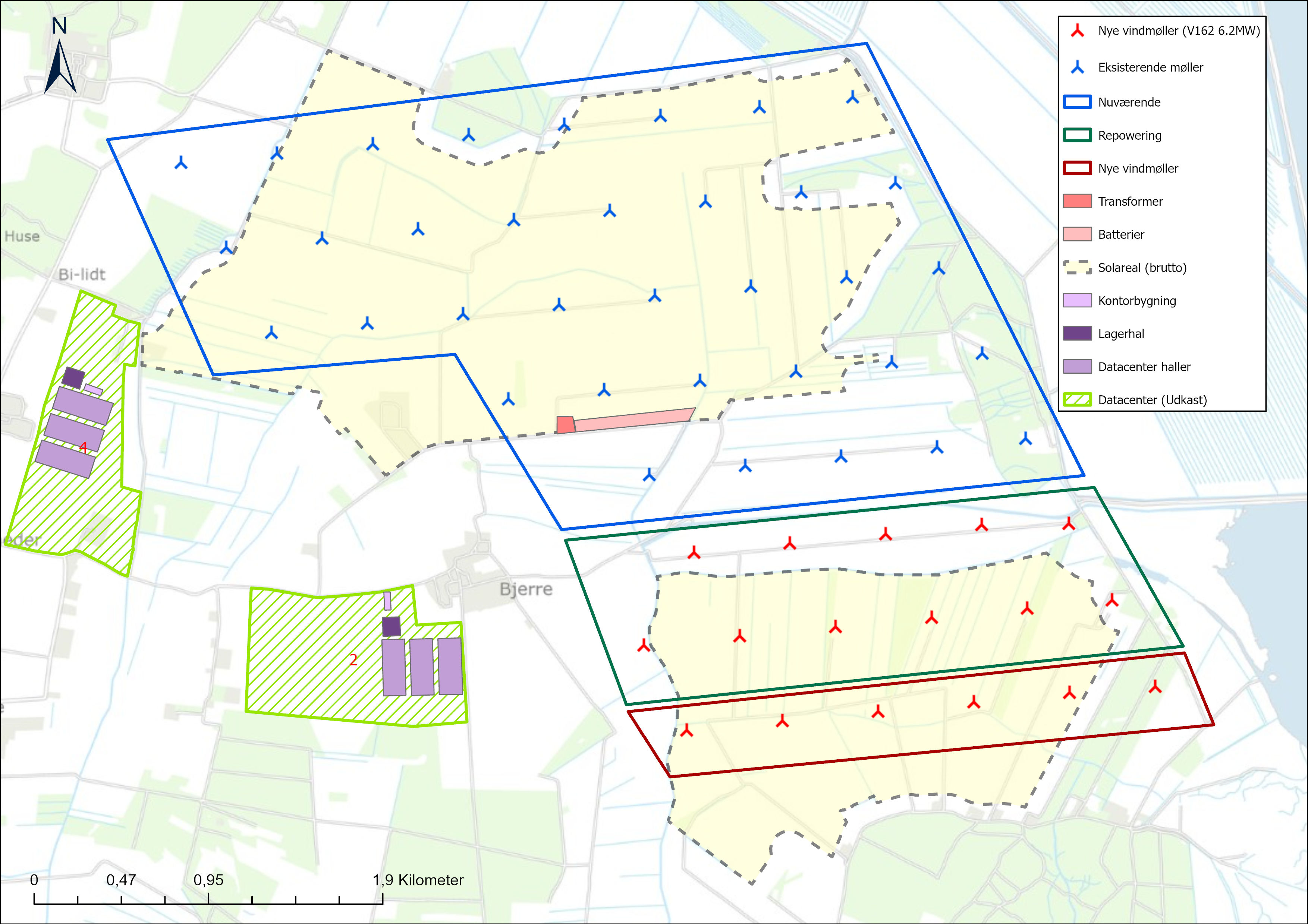 Projektet vil hovedsageligt blive placeret på allerede udnyttede arealer, men inddrager også nye arealer til den sydligste række af vindmøller og datacenteret.