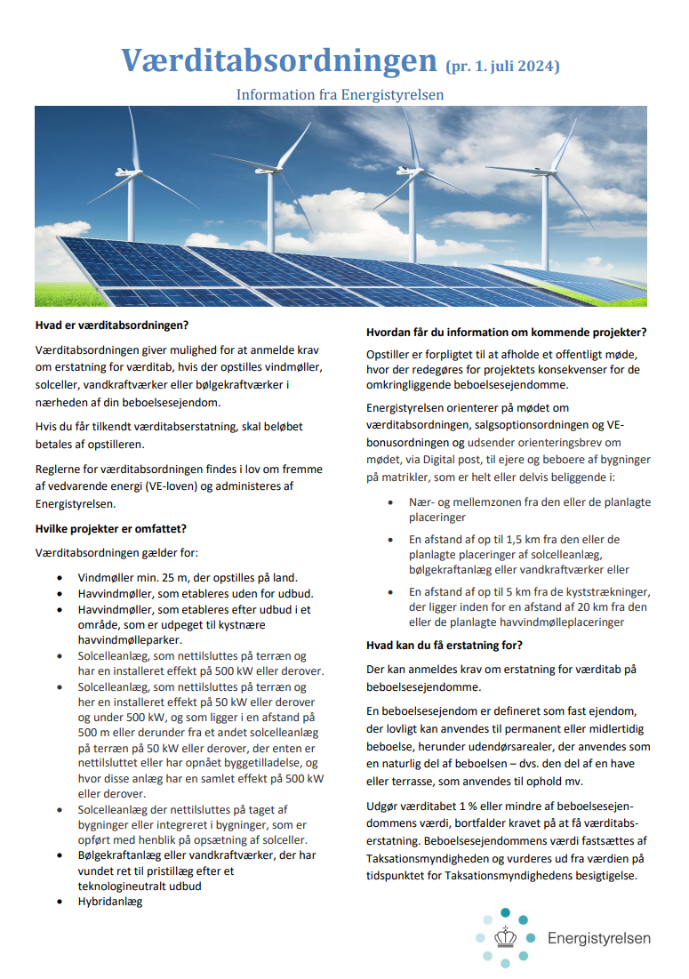 Værditabsordningen giver dig som borger mulighed for, at du anmelder krav om betaling for værditab, ved opstillingen af kommende VE-anlæg i nærheden af din beboelsesejendom. Hvis du bliver tilkendt værditab, skal værditabet betales af opstilleren.
