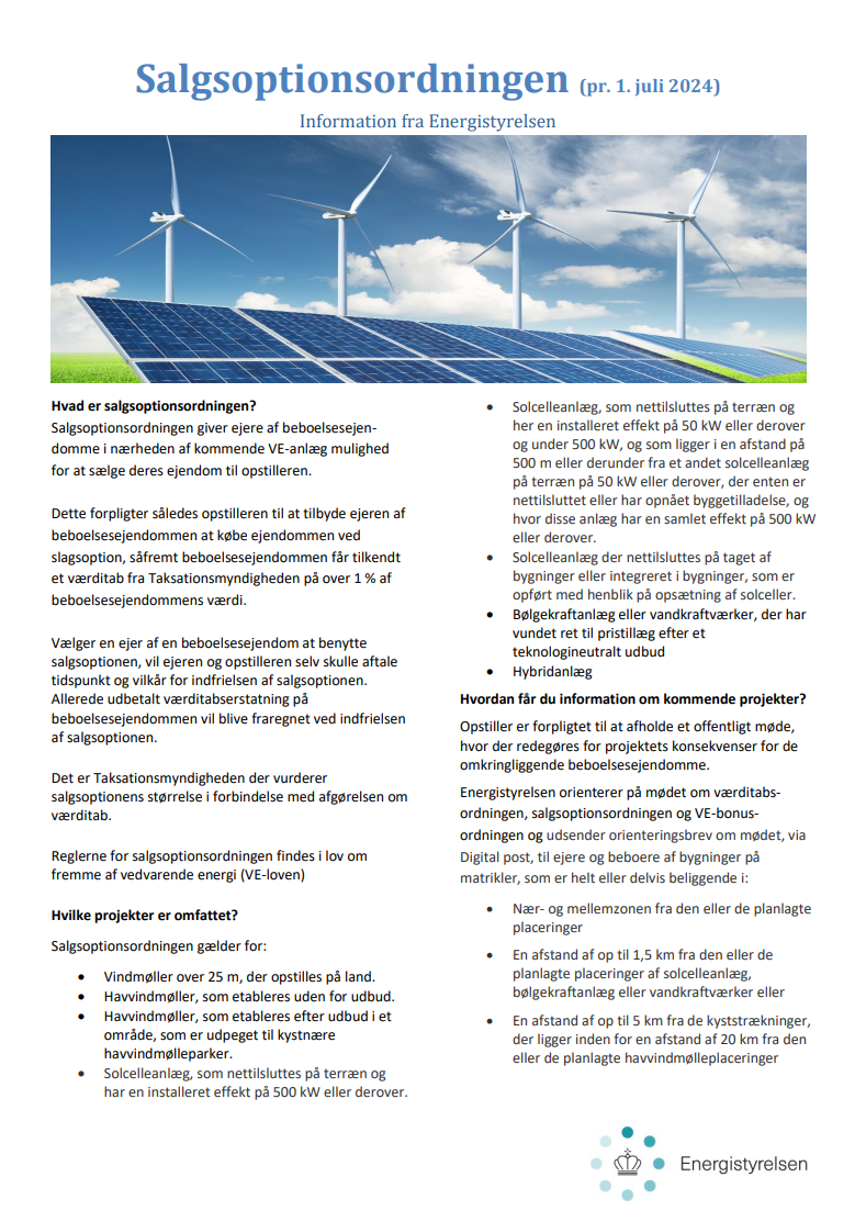 Med ændringerne indføres der blandt andet en salgsoption, der skal tilbydes til naboer til et VE-anlæg. Det vil sige, at opstiller er forpligtet til at købe naboens ejendom, såfremt ejeren heraf ønsker at sælge.
