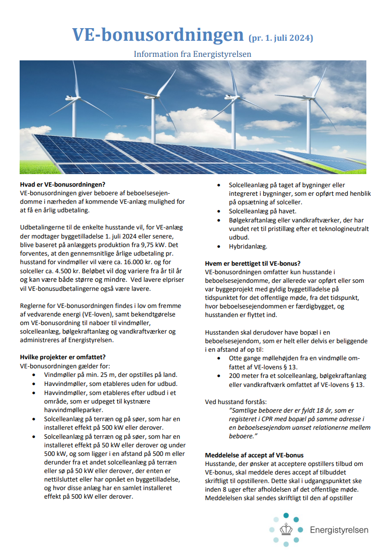 VE-bonusordningen giver beboere af beboelsesejendomme, som er beliggende i en afstand af op til 8 x vindmøllehøjden eller 200 meter fra nærmeste solcelleanlæg mulighed for at få en årlig skattefri udbetaling svarende til en del af anlæggets kapacitet i hele anlæggets levetid.
